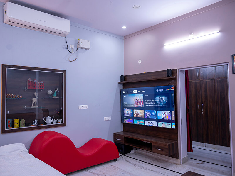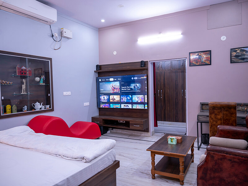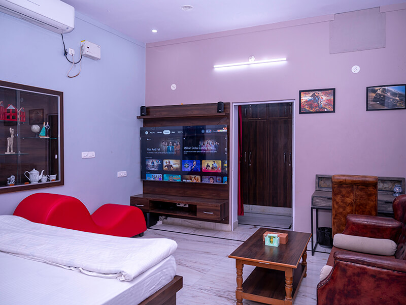 Each room features cozy bedding, elegant interiors, and ample natural lighting. Modern amenities such as air-conditioning, high-speed Wi-Fi, and a smart TV with Netflix and OTT access ensure entertainment and relaxation throughout your stay. Attached bathrooms are equipped with essential toiletries and provide a clean, refreshing environment.
